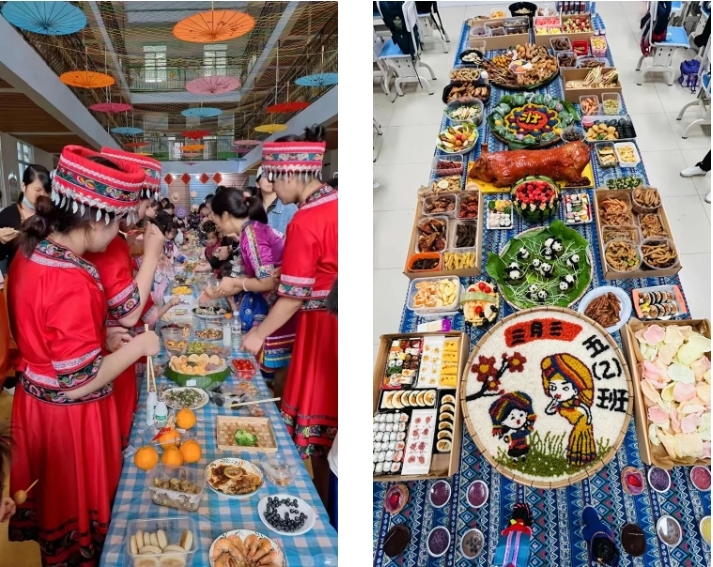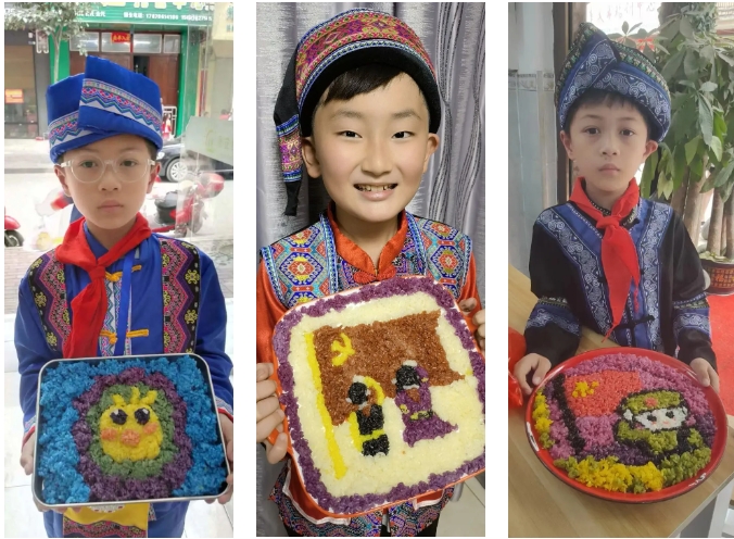 “長桌宴”又稱合攏宴,是侗族、苗族、瑤族等多個(gè)民族的風(fēng)俗習(xí)慣,常用于接親嫁女、滿月酒、村寨聯(lián)誼等宴飲活動(dòng),代表最為隆重的待客禮俗,已有幾千年歷史。“長桌宴”上有壯族特色的五色糯米飯、艾葉糍粑、壯粽,苗族的傳統(tǒng)佳肴,還有黎族的三色飯……一份份美食造型美觀、色彩鮮艷、香味撲鼻。圖為集團(tuán)職工拍攝的孩子參加學(xué)?!叭氯被顒?dòng)。