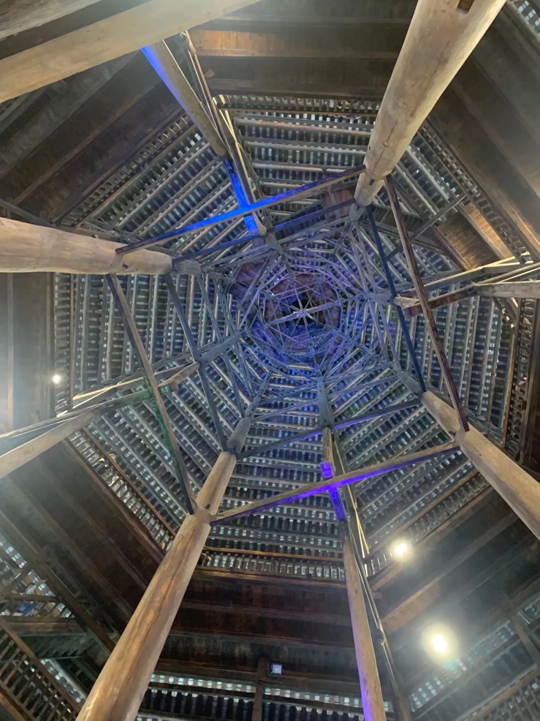 仰觀閃閃魔幻,感受侗族建設(shè)的精美藝術(shù),把疏密、粗細(xì)、剛?cè)岬韧昝赖亟Y(jié)成一個(gè)整體,展現(xiàn)侗族工匠的精美建筑技藝。不用一顆鐵釘,結(jié)構(gòu)十分嚴(yán)謹(jǐn)穩(wěn)固。樓內(nèi)四根杉木大柱直徑都超過70厘米,樹齡均在百年以上,這在鼓樓建筑史上是唯一的。